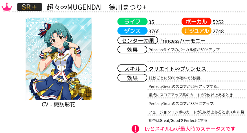 | 11秒ごとに41%の確率で6秒間、Perfect/Greatのスコアが26%アップする。編成にスコアアップ系のカードが2枚以上あるときPerfect/Greatのスコアが33%にアップ、フュージョンコンボのカードが1枚以上あるときスキル発動中はGreat/GoodをPerfectにする |