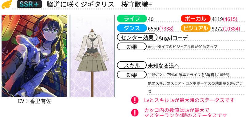 | 11秒ごとに66%の確率でライフを3消費し10秒間、他のスキルのスコア・コンボボーナスの効果量を9%プラス |
