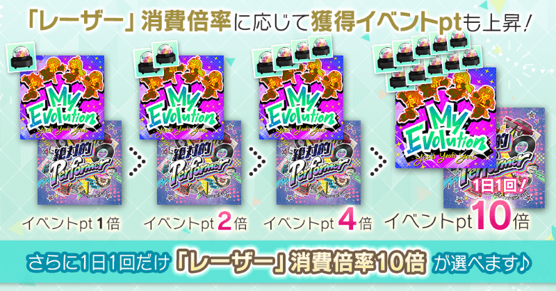 イベント楽曲「My Evolution」と「絶対的Performer」を「ピカピカレーザー」を使用してライブを行うことで、より多くのイベントptを獲得!
