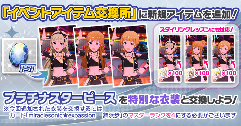 プラチナスターピースを利用して、イベント報酬カードやユニット衣装が交換できる「イベントアイテム交換所」の交換対象に特別な衣装を追加いたしました。
