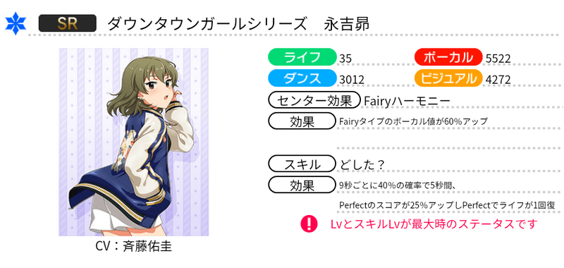 | 9秒ごとに31%の確率で5秒間、Perfectのスコアが25%アップしPerfectでライフが1回復 |