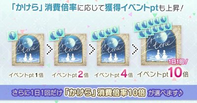 ※「半月のかけら」の消費倍率について、効果があるのはイベントptと「イベント専用ドロップアイテム」です。