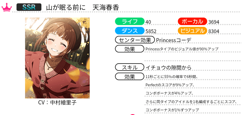 | 11秒ごとに46%の確率で6秒間、Perfectのスコアが9%アップ、コンボボーナスが4%アップ、さらに同タイプのアイドルを1名編成するごとにスコア、コンボボーナスが1%ずつアップ |