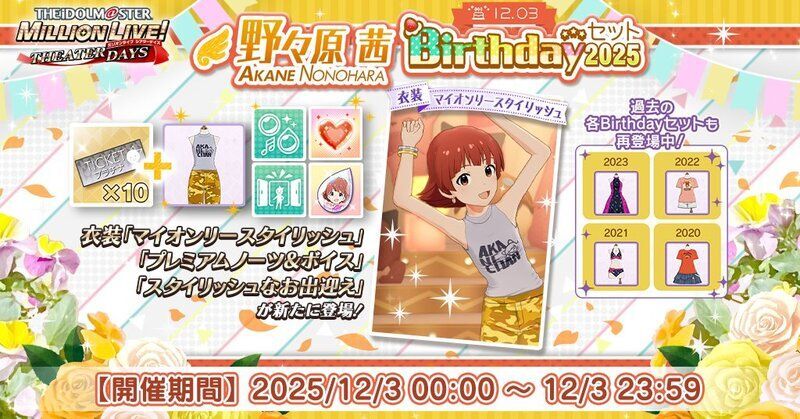 「野々原茜Birthdayセット2025」は、プラチナガシャ10回チケットに衣装「[マイオンリースタイリッシュ]野々原茜」「Birthday Memory 2025[野々原茜]」「茜のスタイルドロップ100個」「茜のスタイリッシュなお出迎え」「プレミアムノーツ&ボイス[茜]」が付いた特別なセットとなっております。