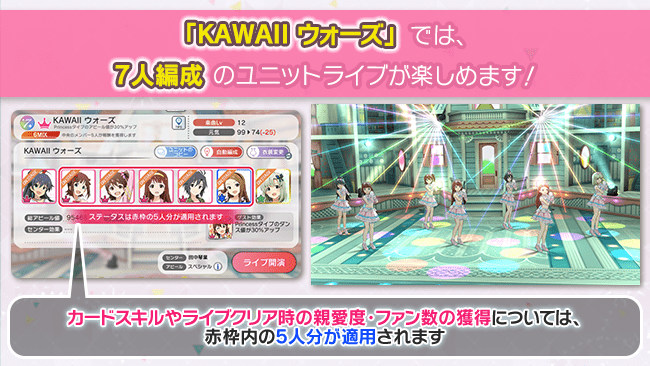 ライブ中のステータスや発動するスキルは、両端を除いた中央5人のアイドルのカード効果が適用され、両端に配置された2名のアイドルのカード効果は適用されません。