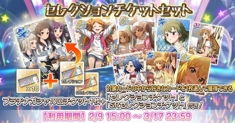 セレクションチケットセットとは「プラチナガシャ10回チケット」に、使用すると対象カードの中から好きなカードを1枚獲得できる「セレクションチケット」と「SRセレクションチケット」が付いた内容となります。