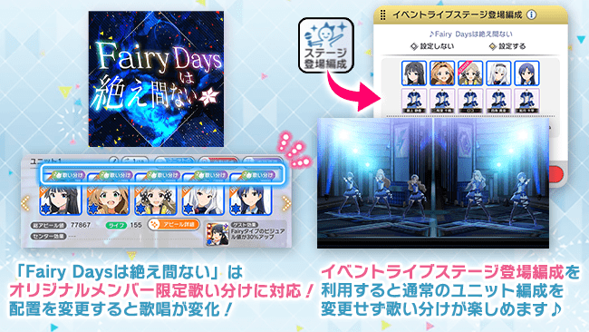 | ・【イベント】プラチナスターツアービンゴ~Fairy Daysは絶え間ない~ イベント楽曲 ・2026/02/24 12:00 通常楽曲として配信開始 | ||