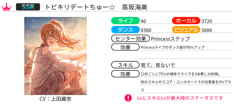 | 11秒ごとに66%の確率でライフを3消費し10秒間、他のスキルのスコア・コンボボーナスの効果量を9%プラス |