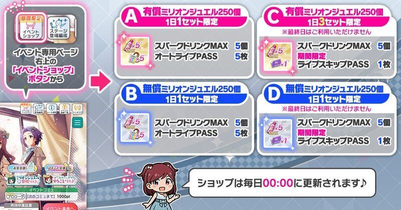 イベント専用ページの「イベントショップ」ボタンから、「スパークドリンクMAX」5個と「オートライブPASS」5枚や「期間限定ライブスキップPASS」1枚セットを毎日数量限定でご利用いただけます。
