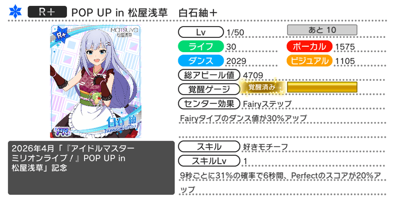 | 9秒ごとに31%の確率で6秒間、Perfectのスコアが20%アップ |