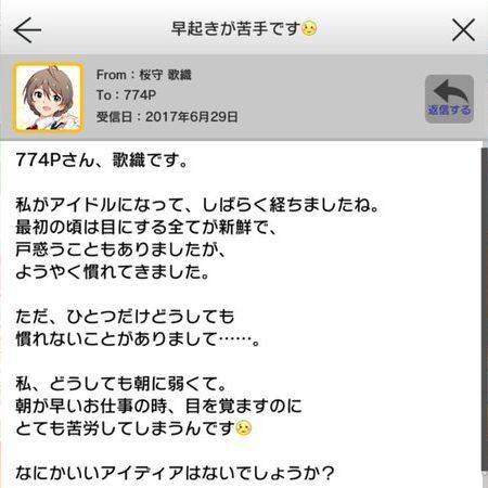 | ○○Pさんは朝スッキリ目覚めるために、何かされていることはありますか?特に、朝早くのお仕事は、遅刻してしまわないか不安で……。どうしたらいいでしょう? | SR【ミリカン!アンコール 桜守歌織】の所持 |