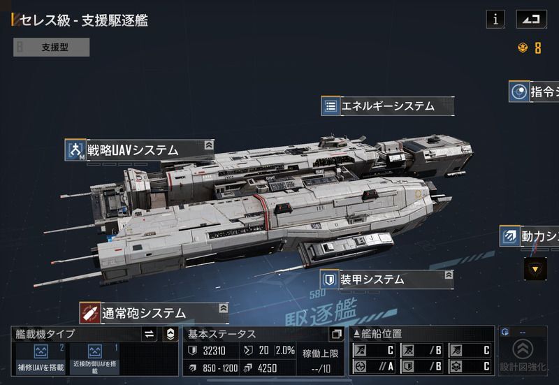 - CAS066級-支援巡洋艦と組み合わせて回復力を補強したり、サブ基地に配備された予備艦隊のサポーターとして小惑星帯での戦闘などに利用可能。シーズン序盤の主力艦隊に入れても心強い。