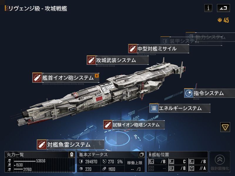 | 攻撃 | 艦首イオン砲システム FI-800型 重イオン砲×1 | 対艦魚雷システム FT-4-160型 クラスター魚雷ランチャー×4 試験イオン砲塔システム FI-400T型 試験型イオン砲塔×4 攻城武装システム FT-1-365C型 攻城魚雷×4 中型対艦ミサイル FM-3x180型 ミサイル垂直発射装置×4 |
