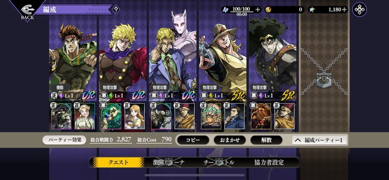 [抜け目ない戦士]ジョセフ・ジョースター UR, 紫属性, 正陣営, 機動 ・回避力と素早さ特化のアタッカー ・デバフもできるので扱いやすい | |