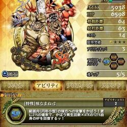 | 〔消費ゲージ:1〕3ターンの間、範囲内(円形大型)の味方が30%(Max.50%)で接触攻撃を回避するようになるッ!更に30%(Max.50%)ダメージカットッ! ※「30%ダメージカット、さらに接触攻撃は30%の確率で攻撃自体を回避」の意 | |