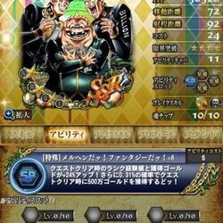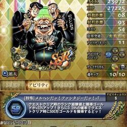 | 〔コスト:5〕クエストクリア時のランク経験値と獲得ゴールドが+10%アップ!さらに0.2%の確率でクエストクリア時に500万ゴールドを獲得するどッ! | |