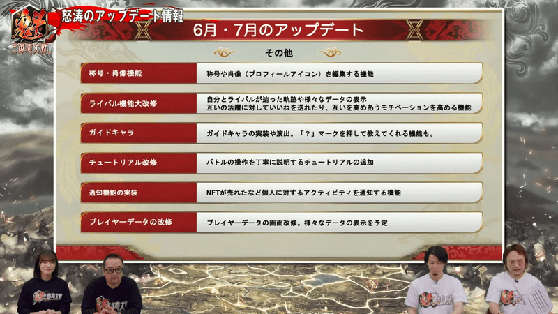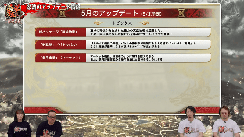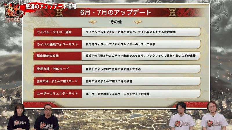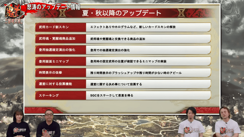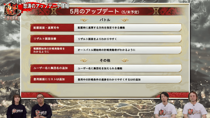『魁 三国志大戦 -Battle of Three Kingdoms-』にて2025年5月2日(金)に放送された公式YouTubeで発表された今後のアップデート情報についてまとめてあります。