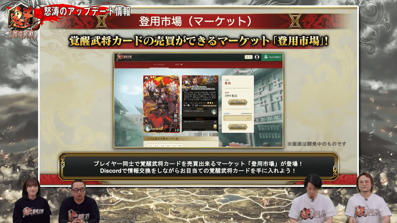 プレイヤー同士で覚醒武将カードを売買出来るマーケット「登用市場」が登場するようです。