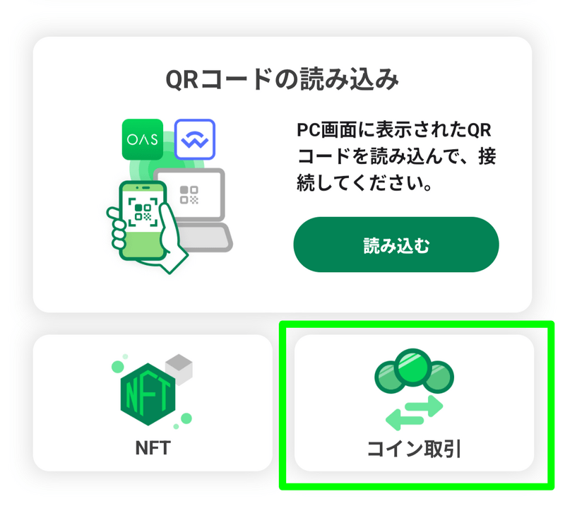 Oasys Passportアプリを開きます。ホームの「コイン取引」をタップ