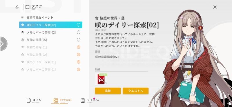 「クエスト」からメインストーリーを進めることでリーダーランクアップに必要な経験値が獲得できます。