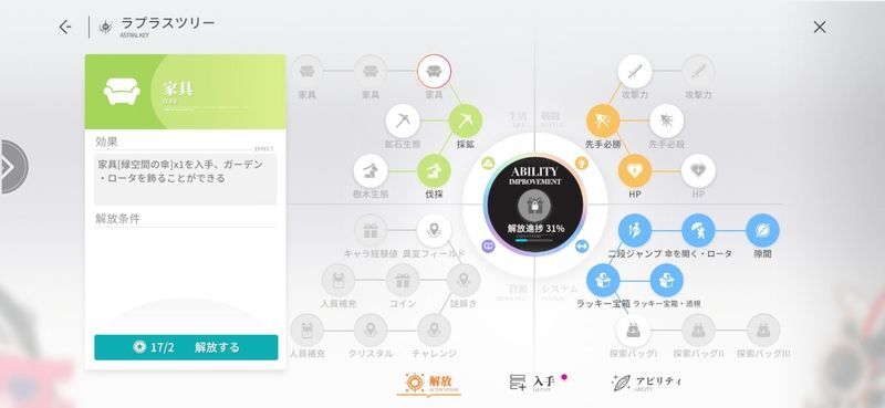 ラプラスツリーの左上生活カテゴリーの解放でも家具を入手できます。