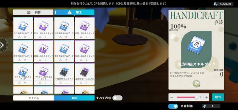 さらに手芸→加工→素材で中級上級のスキルブックを制作することも可能です。