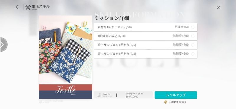 また、ミッションを達成することで裁縫レベルが上昇し、高いレベルのスキル習得や裁縫成功率が上昇します。