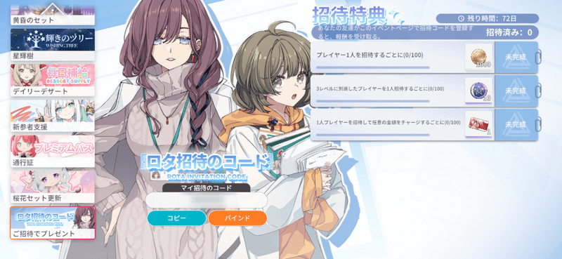 ゲーム内でイベント一覧→ご招待でプレゼントから自身の招待コードの下にある「バインド」を選択します。