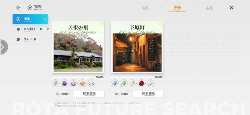 まず各エリアの探索を行います。探索先により獲得できる報酬が異なります。
