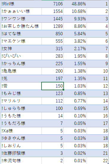 | お茶しか勝たん様 | 941 | 11.8% | 4 |