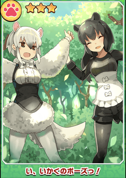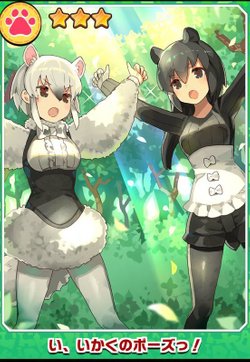 | 解説 | 「ミナミコアリクイちゃん、こんな感じかな?」 「マレーバクぅ、 そんなおっかなびっくりやってたら セルリアンが怖がってくれないよぉ」 「二人で練習するのは楽しいけど、 本番で決められなきゃ意味ないもんね~」 「そうだよぉ! 気合入れていかないと!」 「「せーのぉ!」」 |
