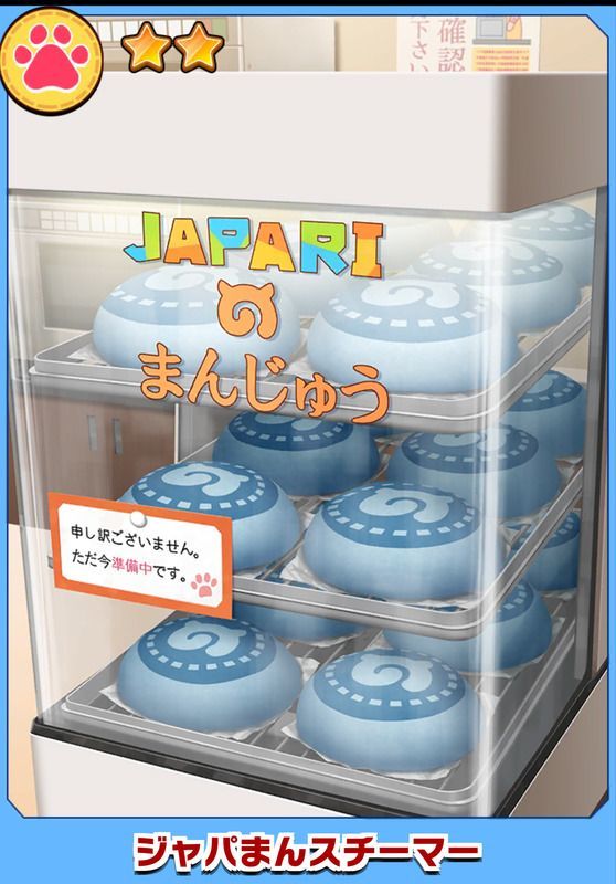 | 解説 | いらっしゃいませ、いらっしゃいませ。 今日もたくさんのフレンズさんに 美味しく召し上がってもらうため、 ほかほかのジャパリまんじゅうを準備中です。 |