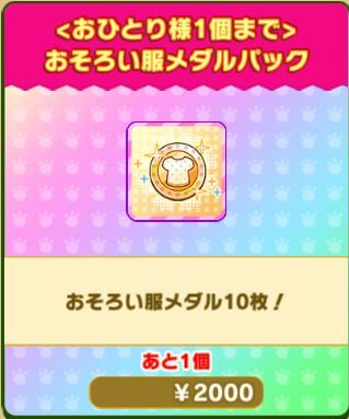 ![]() | 【価格】1,960円 【内容】 ・キラキラ(有償)×64 ・復刻水着メダル×10 |