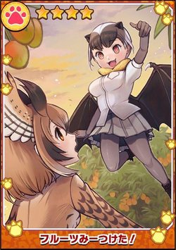 | 解説 | 「あなたがダイトウオオコウモリですか?」 「そう、 だけど・・・あなたは?」 「わたしはワシミミズク。今日はお前に折り入ってお願いをしに来たのです」 「うん?どうしたの?」 「研究に使うくだものを探しているのです」 「そうだったんだ!ならいい場所知ってるよ、わたしについて来て!」 「みーつけた♪ ここだよワシミミズク。このフルーツはとっても甘いんだよ!」 「これは…凄い数のくだものですね。これだけあれば研究材料としては十分なのです」 「そういえば、研究って言っていたけど…どんなことをするの?」 「くだものを日に当てて乾燥させる研究なのです。 くだものは干すことによって、さらにおいしくなります」 「へぇ!そうなんだ、じゃあたくさん必要かな?集めるの手伝うよ」 「助かるのです」 「ワシミミズク、たくさん持ってきたよ」 「これで研究材料がそろったのです。礼を言います」 「くだものを…ほす? だっけ、がんばってね!」 |