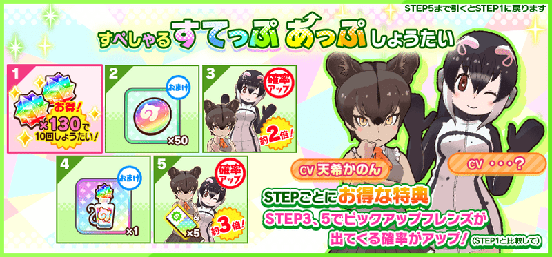 | ×10 | ☆4『タテゴトアザラシ』確率60% ☆4【ゆきやまコンサート】確率40% |