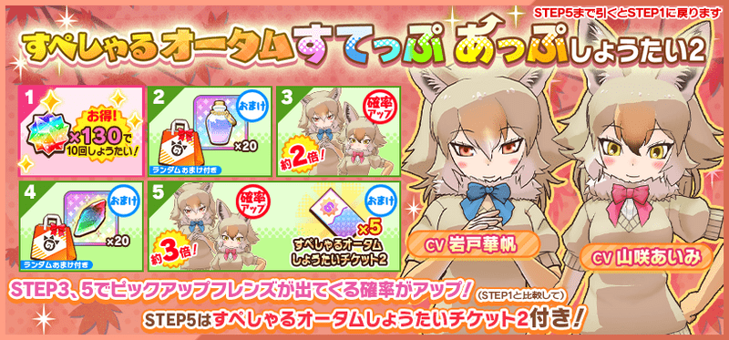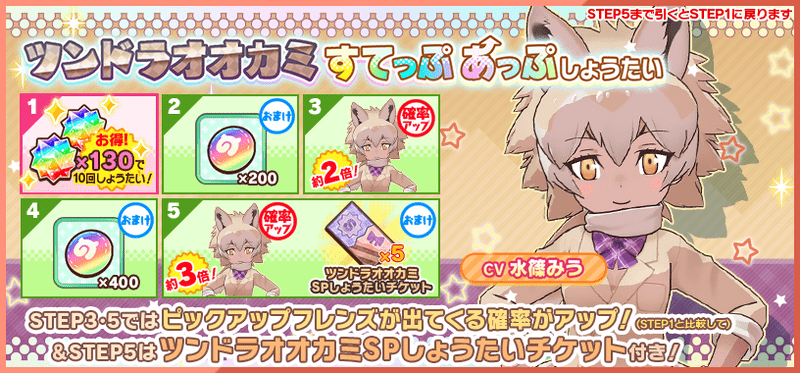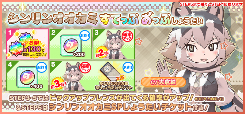| ×10 | ☆4『アフリカンゴールデンウルフ』『キンイロジャッカル』 いずれか確定 |