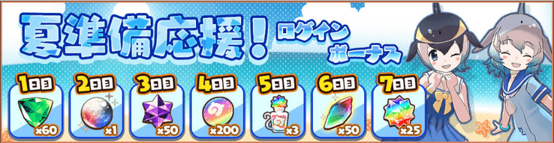 | 期間中累計7日ログイン | 虹色のアニマルラムネSSR×3 |
