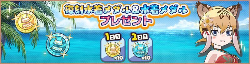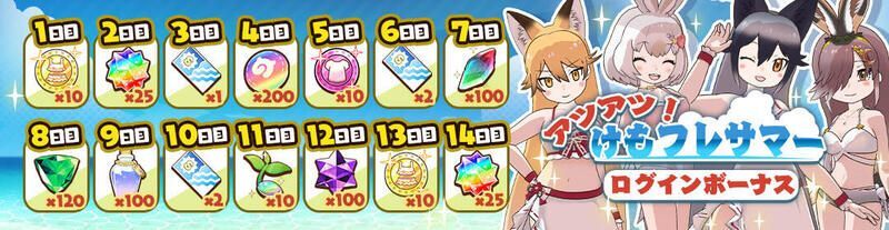 アツアツ!けもフレサマーキャンペーン開催を記念して「キラキラ(無償)×25」「アツアツ!けもフレサマーしょうたいチケット×5」「復刻水着メダル×10」をプレゼント♪