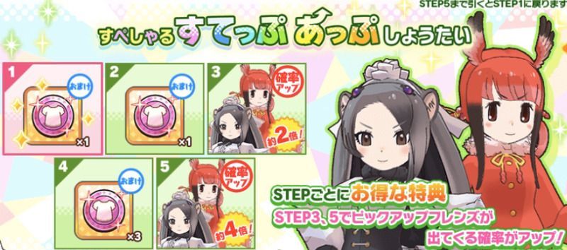 途中でもPUフレンズの確率が2倍/4倍になるSTEPもあるため、うまくいけば複数体PUフレンズを確保できる可能性があるのも魅力的です。