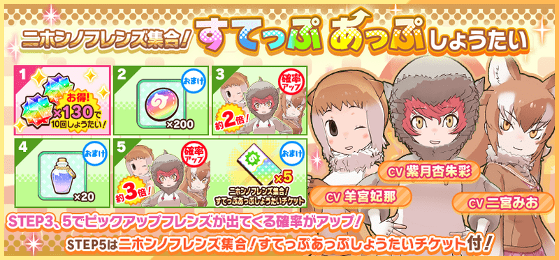 通常のすぺしゃるすてっぷあっぷにおいて、最終ステップで入手できる「ニホンノフレンズ集合!すてっぷあっぷしょうたいチケット」を15枚集める事で任意のピックアップフレンズ確定ガチャを引くことができます。