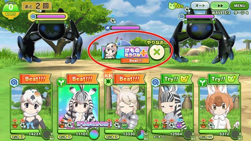 強化フラッグがBeat!!!の場合はBeat!!!、Try!!の場合はTry!!、Action!の場合はAction!で「けものミラクル」を発動すると、「けものミラクル+」となります。