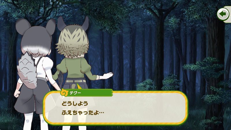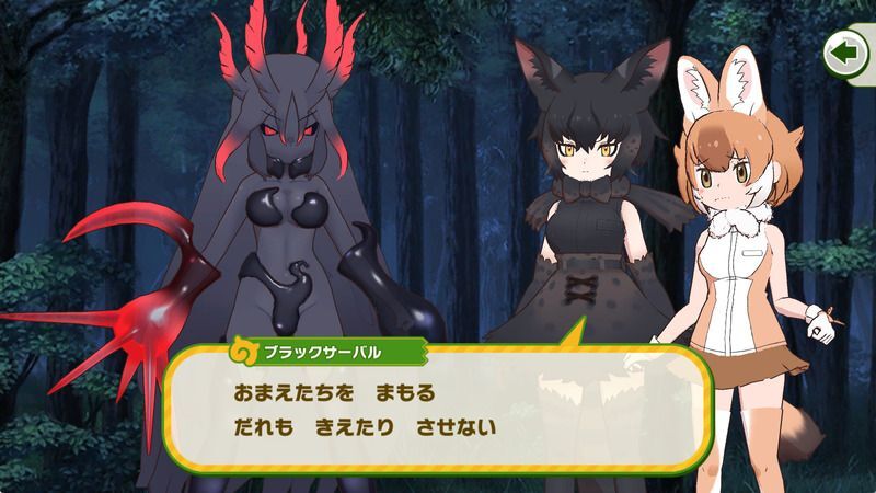 | 危険のない場所を探すうち、ブラックサーバルは夜の森でセルリアンに襲われるキタキツネを見つけ、おとりとなって逃がしてあげます | |