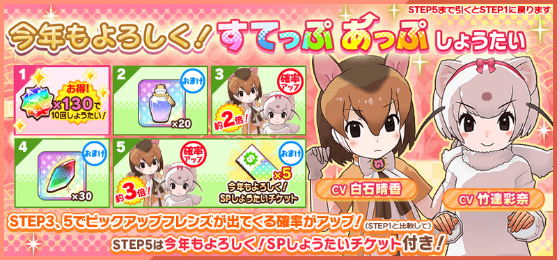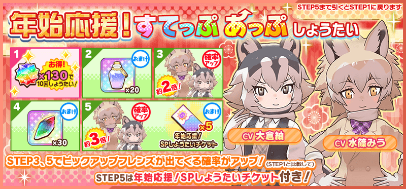 | ×15 | ☆4『エリマキトカゲ』確定 おまけ お年玉だよ!千両箱のネックレス×1 ☆4【しょうがないわね!】×1 |