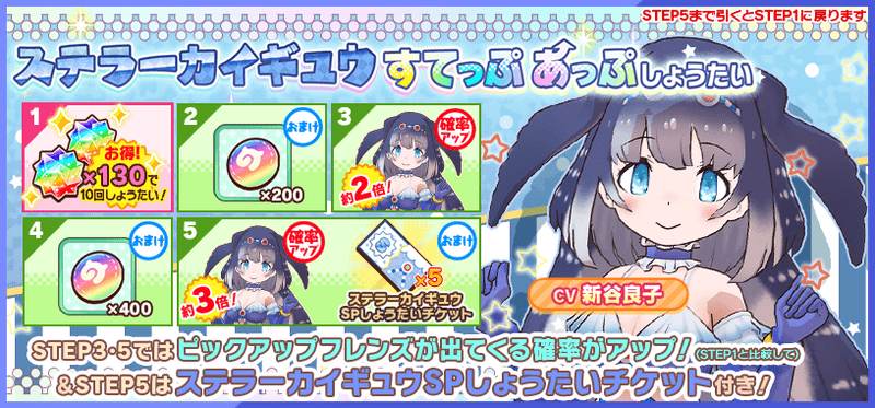 | ×3 | ☆4『エリマキトカゲ』確率20% ☆4【しょうがないわね!】確率7% ☆3【お料理教室】確率10% |