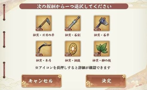 「夕闇の神冥」のイベントステージをクリアすることで【石包丁】、【台付壺】が獲得でき、限定家具や日ノ鈴などの様々なアイテムと交換することができます。
