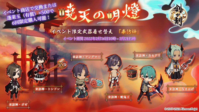 【暁天の明燈】のイベントステージをクリアする事で【不滅の明燈】を獲得でき、【不滅の明燈】はイベント商店にてイベント限定武器着せ替え「万華鏡・来訪神」のほか、限定家具「ぬいぐるみ・竜燈鬼」、今回登場する武者それぞれの専属衣装「来訪神」等と交換する事が可能です。