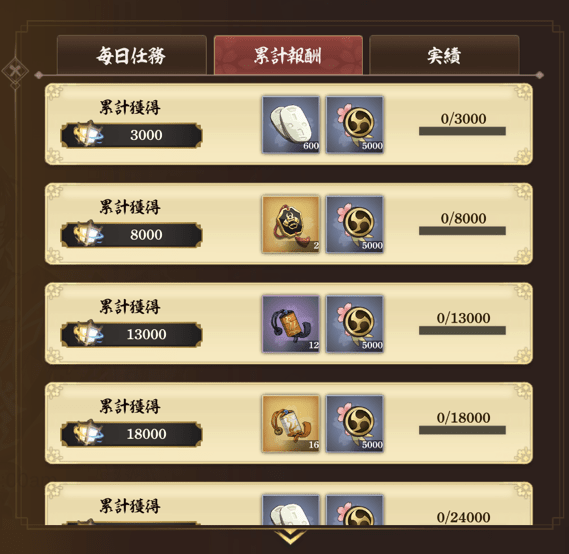 イベント画面にある「報酬」から、「毎日任務」「累計報酬」「実績」が確認出来ます。