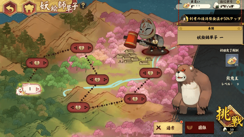 「妖絵師草子」は全7話構成で、各章それぞれに難易度が「通常」と「困難」の2種類設定されています。各ステージで【貝覆い】がドロップします。