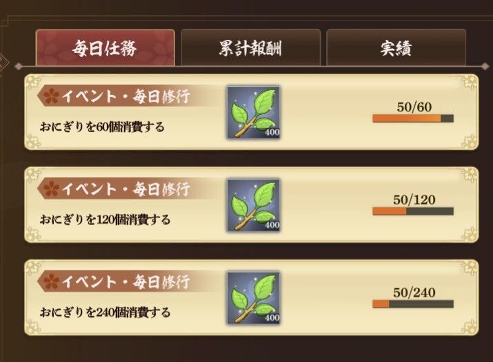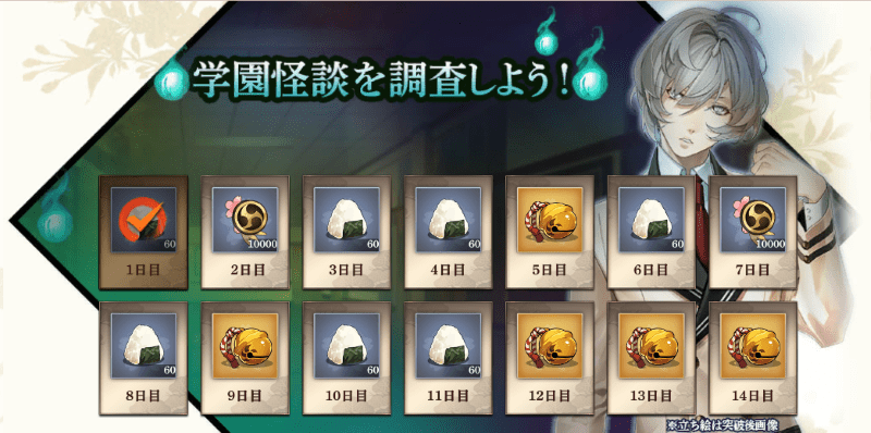 期間中全てログインすると【訓練点20,000、おにぎり420個、日ノ鈴5個】が獲得出来ます。