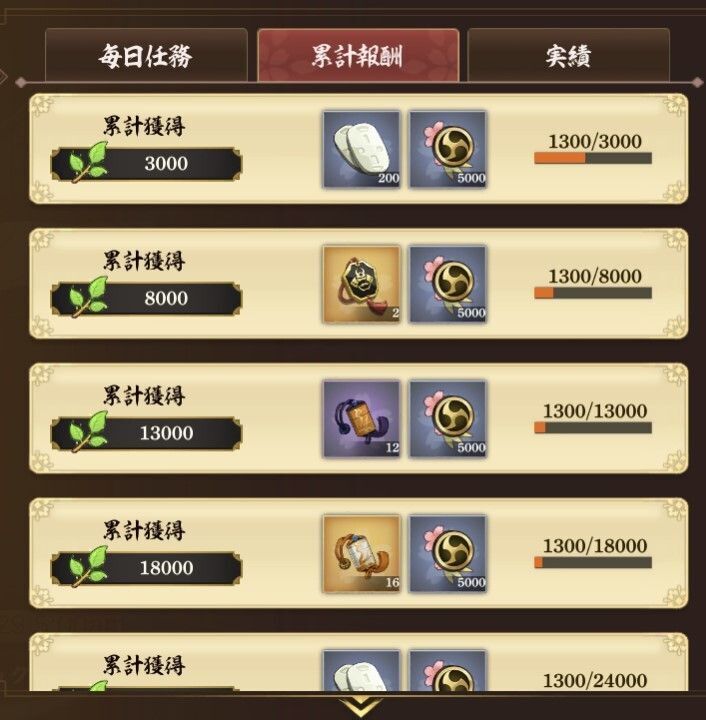 | 金の印籠×30/雪月花真義宝箱×15/御酒の匣×30 銅貨×45,000/訓練点×208,000 | |